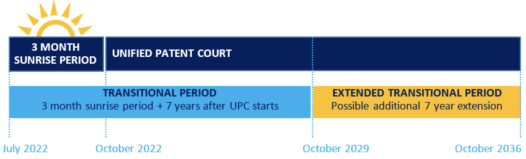 The transitional period will expire at least seven years after the UPC comes into effect. It may, however, be extended by a further seven years. Continuing the above example, the transitional period could therefore expire on 01 October 2029 or 01 October 2036. An opt-out timeline with example dates is shown below.